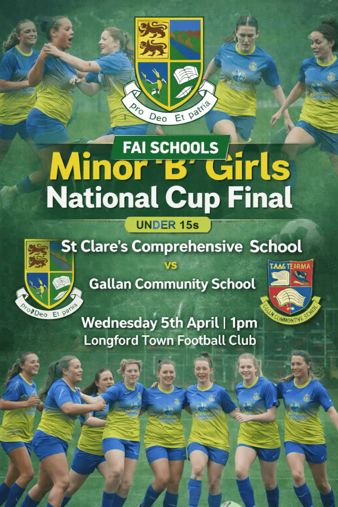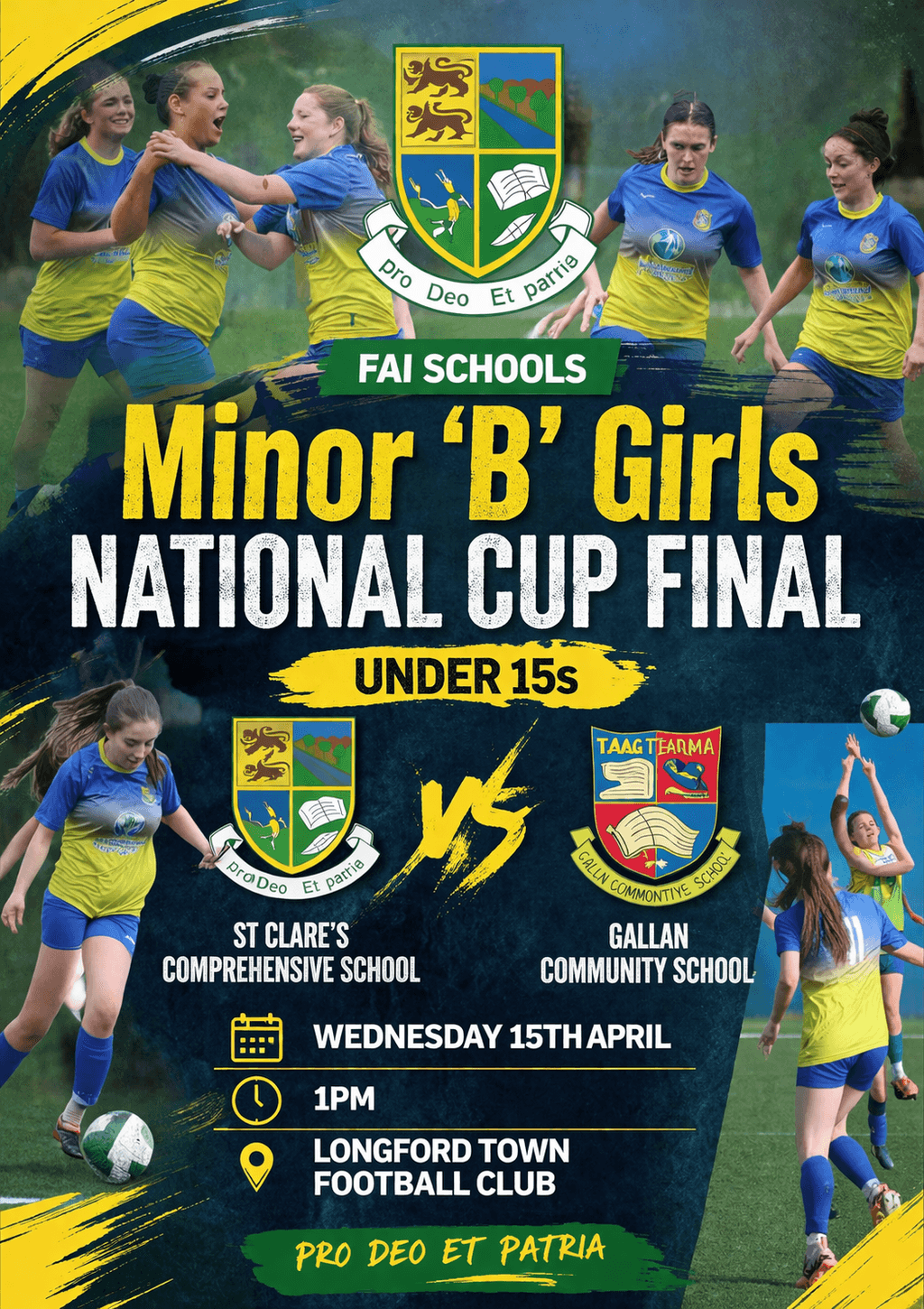 We wish our Under 15 girls the best of luck in the FAI Schools Minor ‘B’ Girls National Cup Final.