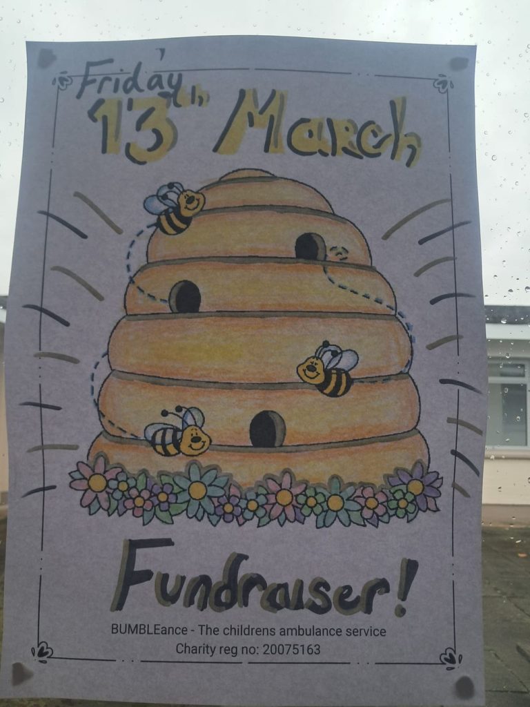 Cake sale. Bumble bee lollipops, pens all on sale Fri 13th March. This is a fundraiser for the BUMBLEance. A child friendly ambulance that a pupil of ours used lately to go to hospital. Please support by buying something and wearing black and yellow on Friday 13th.